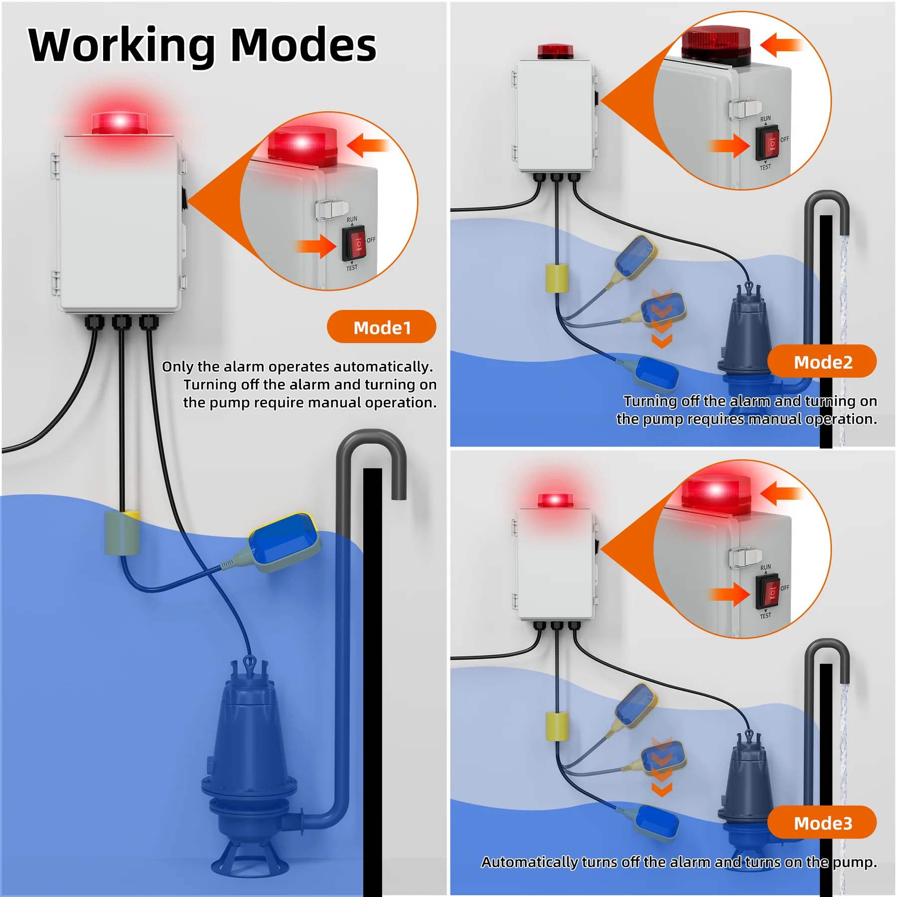 【Modes de fonctionnement polyvalents】 - Le système de contrôle de la pompe de puisard offre des modes de fonctionnement flexibles pour répondre à divers besoins. Le mode 1 active automatiquement l'alarme mais nécessite un fonctionnement manuel de la pompe, comme les images détaillaient. Le mode 2 nécessite un fonctionnement manuel de la pompe pour allumer l'alarme et la pompe. Le mode 3 contrôle automatiquement la pompe et allume l'alarme en fonction du niveau d'eau.