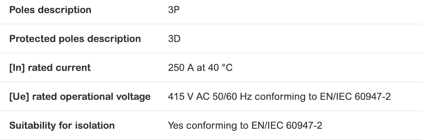 Il s'agit d'un disjoncteur complet de 3 pôles composé d'un cadre de disjoncteur 400A et d'une unité de déclenchement magnétique thermique (TMD). MCCB a un bon rapport prix-performance pour les applications de base et offre une protection électrique fiable pour vos applications. La capacité de rupture (USI) est de 36kA RMS à 415VAC 50 / 60Hz. La tension opérationnelle est de 415VAC 50/60 Hz. Ce produit incorpore une unité de déclenchement thermique (TMD) (IN) (IN). Cette unité de déclenchement TMD fournit un IR de protection thermique réglable (contre les surcharges) avec une plage de réglage de 0,7xine à 1xine (175a-250a). Et il fournit une protection magnétique fixe (contre court-circuit) réglée sur 12xin (3000a). MCCB est livré avec une variété d'accessoires en option simple à choisir et à installer. Les dimensions du produit sont de 120 mm (largeur) x 205 mm (hauteur) x 105 mm (profondeur). Le poids est de 3,5 kg.