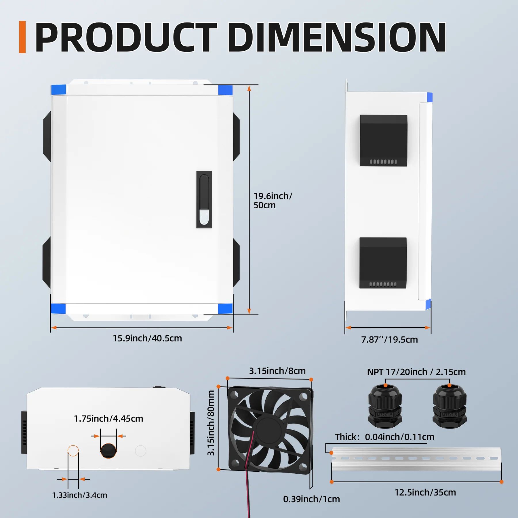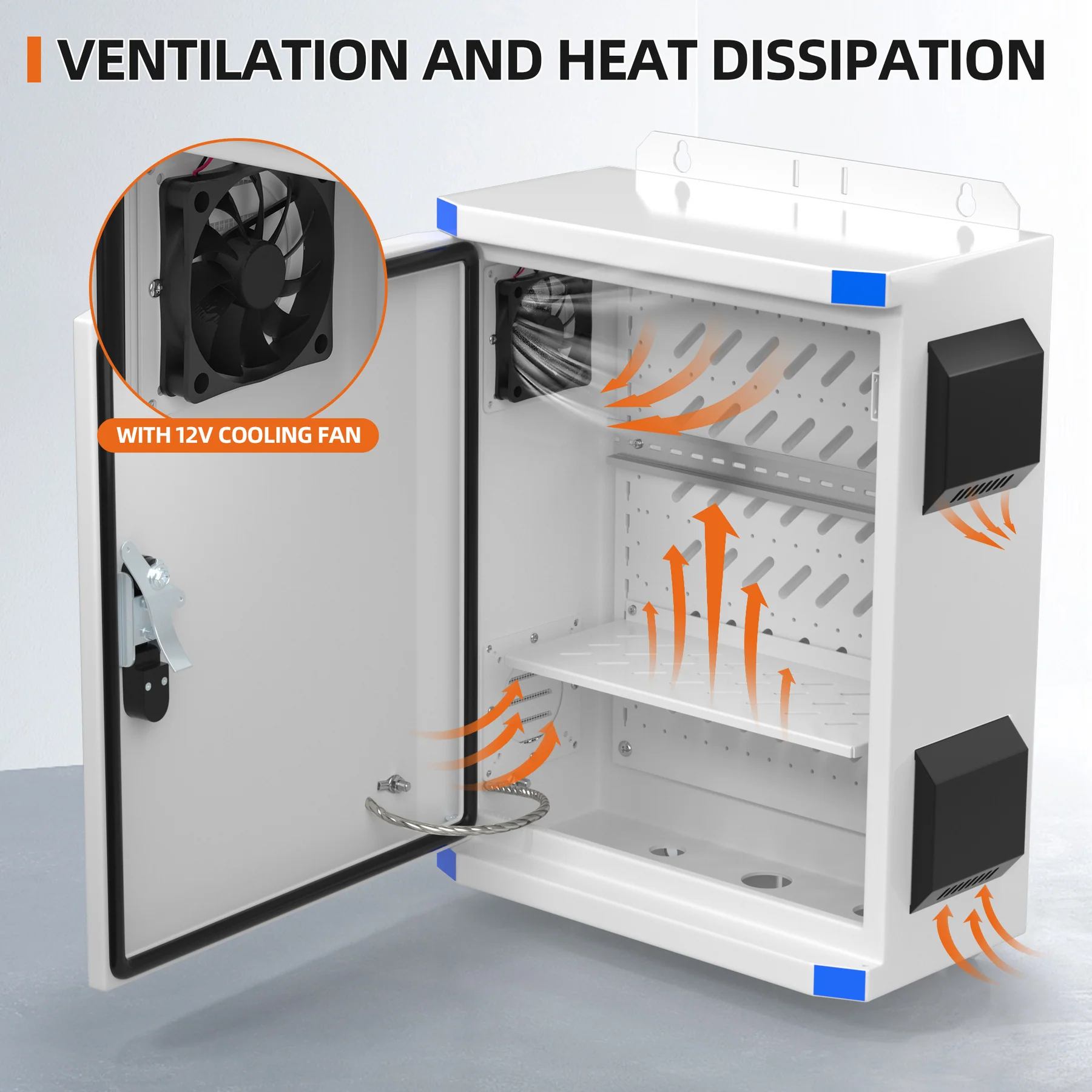 【Dissipation de chaleur efficace】 - La boîte de jonction est conçue pour une gestion thermique optimale. Il est équipé d'un ventilateur de refroidissement 12V (80x80x10mm) et comprend deux emplacements de ventilation de chaque côté pour faciliter un flux d'air efficace. Cette combinaison de caractéristiques garantit que la chaleur générée par l'équipement interne est rapidement et efficace, empêchant la surchauffe.