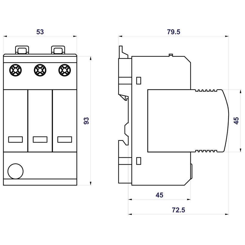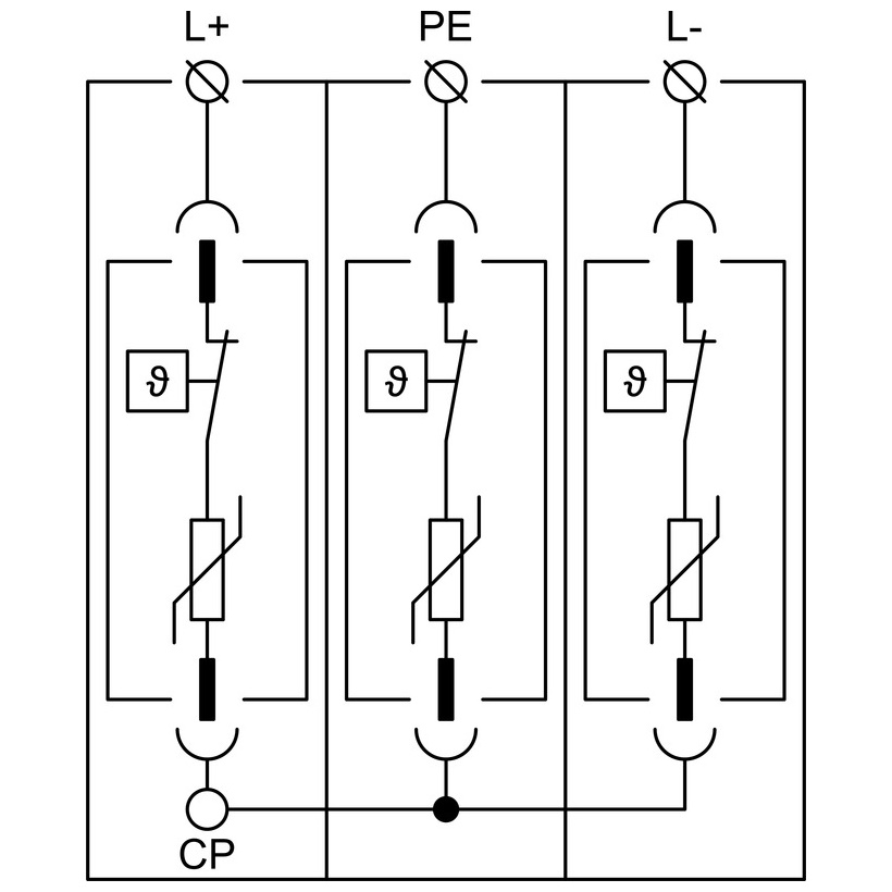 Chaque secteur de varistor entre L +, L - et PE est équipé d'un déconnexion thermique interne. En fin de vie de Varistor (surchauffe), le déconnecteur se déplace pour interrompre le courant CC et fournit une indication de défaut claire. La construction spéciale du déconnecteur permet une installation sans fusible de sauvegarde séparé, simplifiant la coordination et l'espace d'économie.